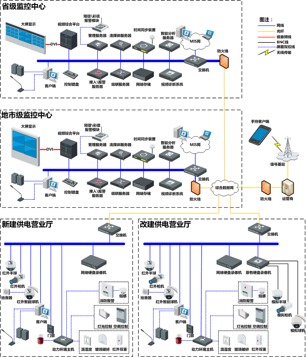 供电营业厅综合监管系统是集硬件、软件、网络于一体的大型联网监控系统,以能源行业iVMS-9800平台软件为核心,实现多级联网及跨区域监控,在营销监控中心即可对前端系统集中监控、统一管理,全面兼顾经营服务和安全运营。