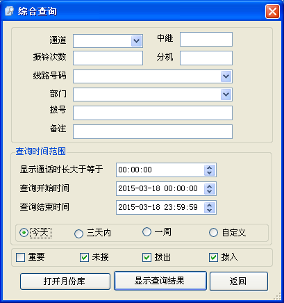 9、“综合查询”界面:可以按姓名,线路号码,部门等指定条件来查找,统计录音记录。